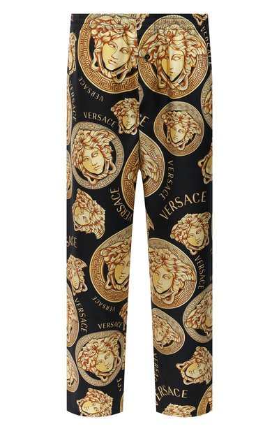 Среди достоинств черных брюк не только крупный повторяющийся принт в виде головы горгоны Медузы. Для пошива мастера марки использовали невесомый шелковый твил. Тонкая ткань гарантирует прочность и удобство. Изделие дополнили широким эластичным поясом, который не давит на кожу. Такая модель идеальна как для сна, так и просто для отдыха дома.