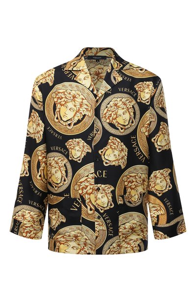 Черная сорочка свободного кроя будет хорошим решением для сна и отдыха. Мастера марки выполнили модель из шелкового твила, который настолько тонкий и легкий, что изделие из него почти не ощущается на теле. Ткань покрыта фирменным крупным принтом в виде символа бренда — головы горгоны Медузы.
