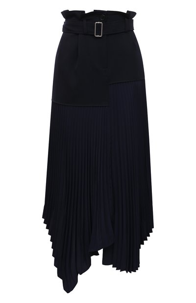 Спокойный темно-синий оттенок этой юбки из весенне-летней коллекции компенсировали асимметричным кроем и контрастом фактур. Для пошива изделия использовали плотную гладкую шерсть и шелковистый текстиль с объемной плиссировкой. Широкий пояс с серебристой пряжкой акцентирует внимание на талии.