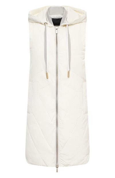 Бежевый удлиненный жилет выручит в прохладную погоду и может стать дополнительным утепляющим слоем в комплекте со свитером, джинсами и пальто. Для пошива модели из весенне-летней коллекции Лорена Антониацци выбрала шелковистый непромокаемый нейлон, для внутреннего наполнителя – легкий синтеп он. Регулируемый капюшон и трикотажный воротник-стойка защитят голову от дождя и ветра.
