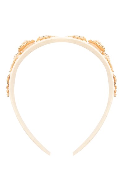 Широкий кремовый ободок выполнили из легкого гибкого полимера, который надежно удерживает волосы, не повреждая их структуру. Каркас, обтянутый фактурной лентой грогрен, украсили пряжками в виде листьев и цветов, усыпанных сияющими кристаллами и перламутровыми бусинами, стилизованными под жемчужины.