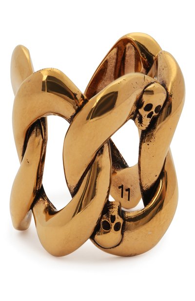 Массивное незамкнутое кольцо из ювелирного сплава оттенка античного золота может стать ключевым акцентом в образе, если выбрать простой наряд. Аксессуар из соединенных между собой овальных звеньев украшен миниатюрными черепами, знаковыми для марки.
