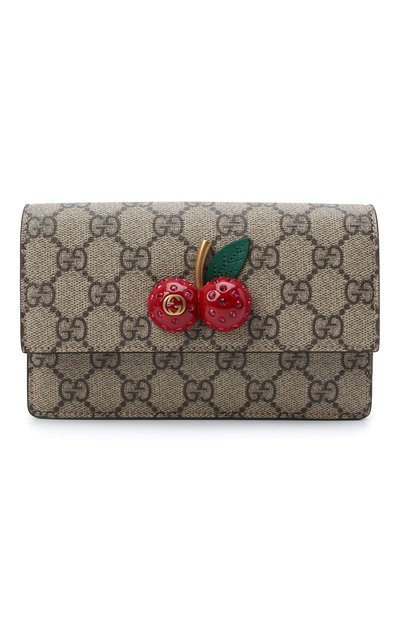 Бежевая сумка Sparkling Cherries из весенне-летней коллекции может стать ключевым объектом в образе. Справиться с задачей ей позволит как узор GG Supreme, так и крупная фигурная пряжка в виде двух вишен, украшенная стразами. Мастера бренда, основанного Гуччио Гуччи, выполнили модель из плотного материала. В аксессуар со съемным плечевым ремнем-цепочкой поместятся паспорт, ключи и помада.