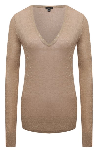 Дизайнеры бренда, основанного Джозефом Эттедги, нашли еще один способ добавить образу блеска. При создании бежевого пуловера из весенне-летней коллекции в нежную шелковистую пряжу вк лючили нити золотистого люрекса, отвечающего искрами на каждый луч света. Более прочным изделие с глубоким V-образный вырезом, визуально вытягивающим шею, делает полиэстер в составе материала.
