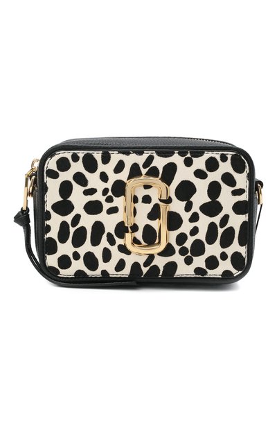 В этой версии су мки The Softshot из коллекции сезона весна-лето Марк Джейкобс сделал ставку на контраст цветов и фактур. Так за основной материал дизайнер выбрал крупнозернистую кожу черного цвета, а для вставки спереди — белоснежную шкуру теленка с черным пятнистым принтом. В небольшой аксессуар со съемным плечевым ремнем поместятся смартфон, картхолдер и ключи, а во внешнем слоте удобно хранить зеркало.