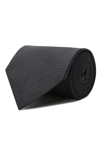 Для изготовления широкого темно-синего галстука с жаккардовым микроузором, придающим изделию визуальный рельеф, мастера марки использовали плотный матовый шелк. Выполненные вручную швы получились эластичнее машинных, поэтому аксессуар хорошо держит форму, не перекручиваясь.