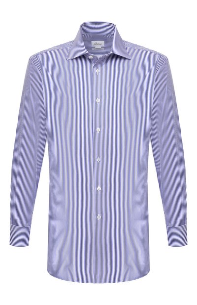 Голубая сорочка в акцентную синюю полоску выглядит не так формально, как однотонные модели, но по-прежнему удачно рифмуется со строгими брюками и пиджаком. Для пошива изделия из весенне-летней коллекции мастера марки использовали плотный дышащий хлопок длинноволокнистого сорта. Все детали выкроили вручную.
