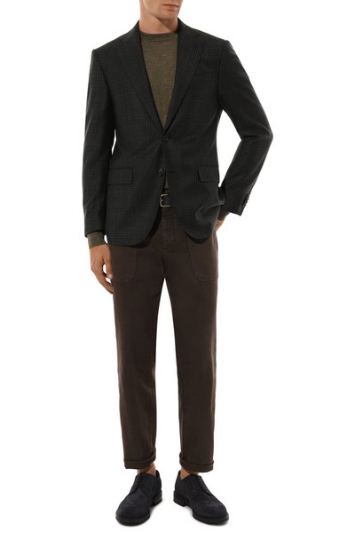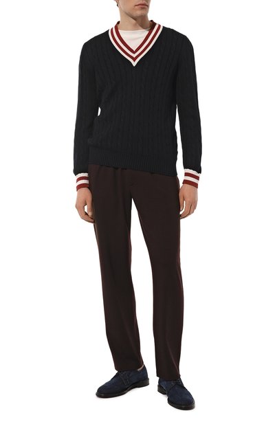 Броги с открытой шнуровкой, как у дерби, и кожаной внутренней отделкой выполнили из замши. Пару с тисненой эмблемой сбоку установили на нескользящую резиновую подошву с фирменными круглыми шипами.