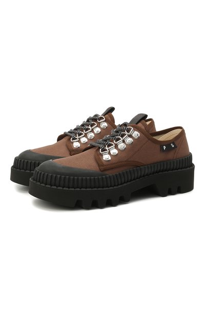 Коричневым ботинкам из весенне-летней коллекции привили гены сразу двух видов обуви: спортивной и туристической. Модель из прочного канваса дополнили серебристыми D-образными люверсами, как у хайкеров, и резиновой накладкой на мысе, как у классических кедов. Из такого же материала выполнили широкий рифленый рант, поэтому пара на подошве с глубоким пр отектором не боится луж.