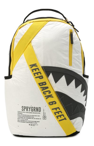 Белый рюкзак, декорированный аппликацией в виде знакового изображения акульих челюстей, выполнили из светоотражающего текстиля. Этот ультрапрочный непромокаемый материал не рвется, не боится химических веществ и легко очищается от загрязнений. В аксессуар с эргономичной сетчатой спинкой поместятся документы формата А4, планшет и складной зонт, а в кармане на передней панели удобно хранить смартфон.