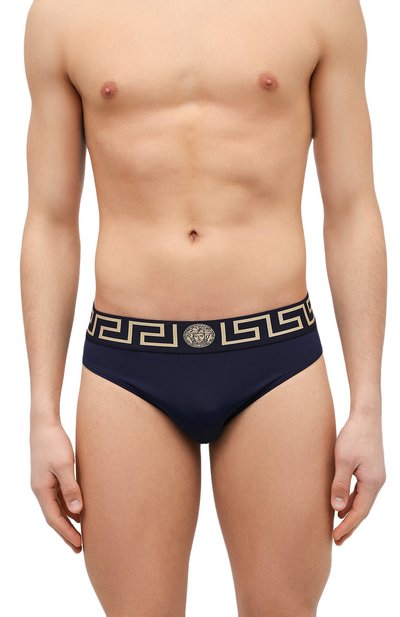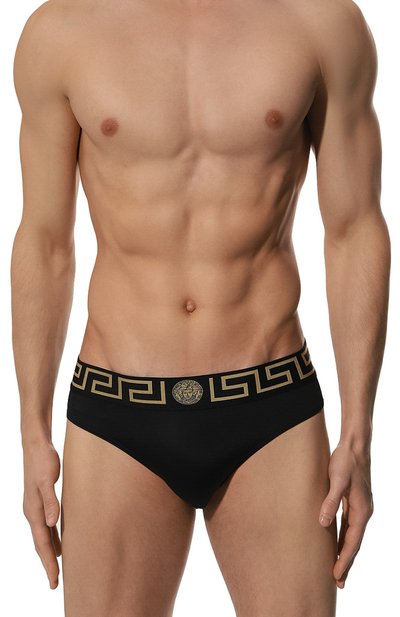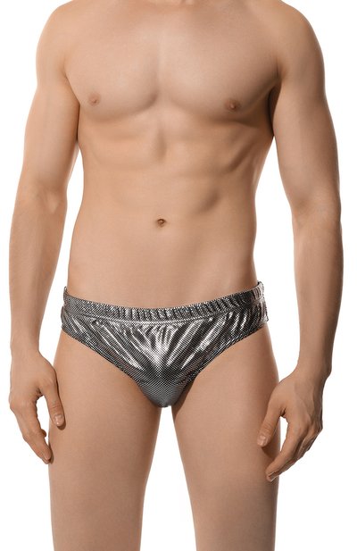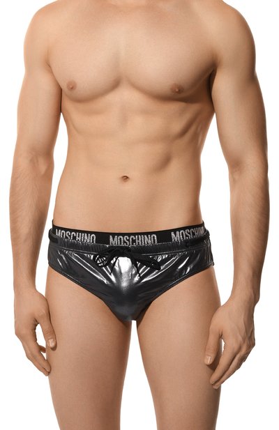 Черные плавки произвели из мягкого быстросохнущего нейлона, который хорошо тянется и комфортно облегает тело благодаря добавлению эластичных волокон. Модель фиксируется нешироким поясом-кулиской со шнурком, который украсили повторяющимся логотипом бренда. Его поддерживает небольшая металлическая пластина с таким же мотивом.