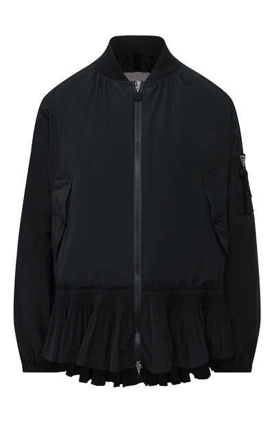 В черном бомбере из коллекции сезона весна-лето не страшны ненастья межсезонья. Модель сшили из прочного тонкого нейлона, а чтобы в такой свободной куртке с трикотажным воротником было комфортнее, ее утеплили тонким слоем легкого отборного пуха. Более женственным и романтичным изделие делает расклешенная гофрированная баска, заменившая привычный пояс.