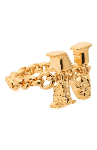 В кольце искусно соединили ключевые черты двух знаковых для бренда линий украшений: Alphabet и Anouck. От первого аксессуар из латуни позаимствовал центральный элемент в форме литеры N, а от второго приобрел фактуру, вдохновленную мятой фольгой. Основу модели выполнили в виде цепи, которую словно протянули сквозь букву, разделив ее ровно на две части.