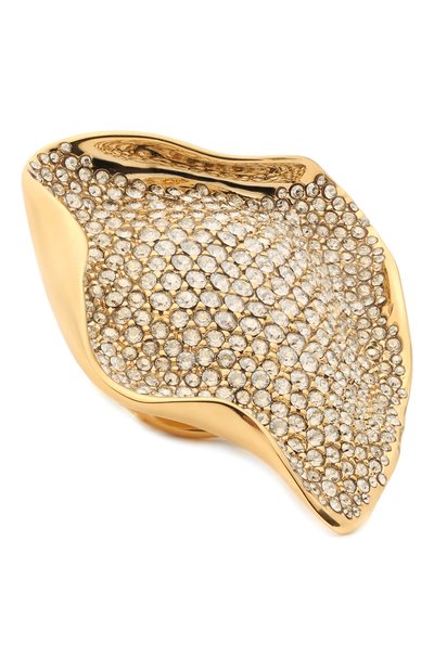 Крупное кольцо из легкого ювелирного сплава с гальваническим покрытием золотом напоминает цветок в духе сюрреализма. Фигурную деталь полностью покрыли прозрачными миниатюрными стразами разного размера. Такой аксессуар — беспроигрышное решение для коктейльного наряда.