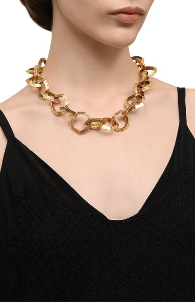 Массивное колье – смелое заявление для поклонниц минимализма. Такое украшение сделает правильный акцент в спокойном наряде. Для изготовления аксессуара в форме цепи с фигурными звеньями использовали стерлинговое серебро. Материал с гальваническим покрытием отполировали до зеркального блеска. На Т-образной застежке – выгравированный логотип бренда.