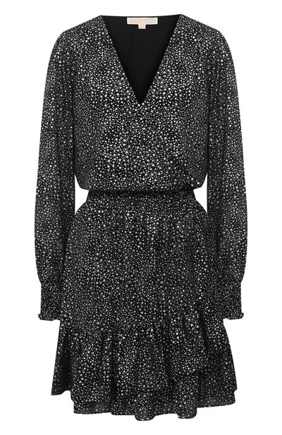 В сочетании с сапогами короткое черное платье с запахом будет уместно смотреться днем, а мюли на шпильке адаптируют его для вечера. За универсальность модели отвечает материал: ее сшили из тонкого легкого жоржета с серебристым принтом в виде россыпи миниатюрных звезд. Майкл Корс украсил вещь из весенне-летней коллекции широкой объемной оборкой на подоле, а талию подчеркнул эластичной вставкой.