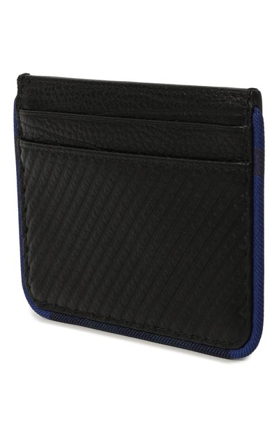 Функциональные возможности черного картхолдера расширили за счет разделительного кармана, в котором удобно хранить купюры и чеки. Для пошива изделия использовали мягкую прочную кожу. Боковые панели украсили тисненой эмблемой бренда, которую вписали в мотив, имитирующий стеганый узор.