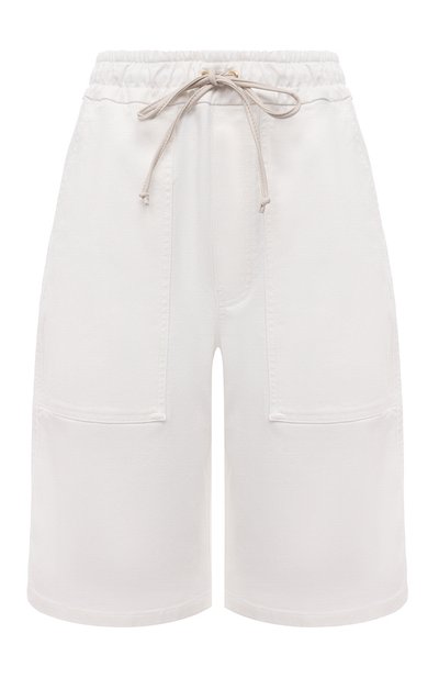 Белые джинсовые шорты свободного кроя, с широким поясом-кулиской и задними накладными карманами из знаковой для марки веганской кожи сшиты из мягкого стрейчевого хлопка. Модель из круизной коллекции поможет создать расслабленный образ с майкой, сабо и курткой.