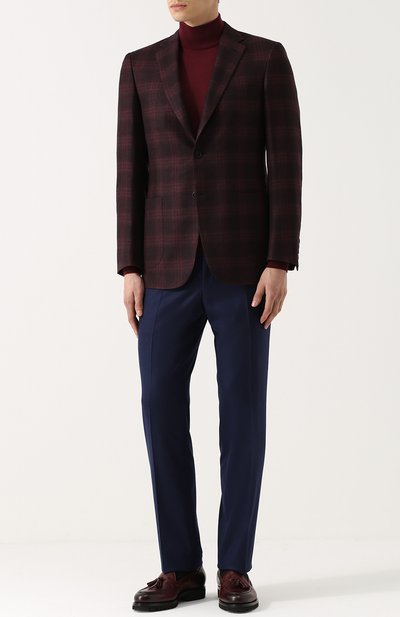 Для создания пиджака в крупную клетку использовали шерстяную ткань Centoventimila. Однобортную модель с заостренными лацканами дополнили прорезными карманами.