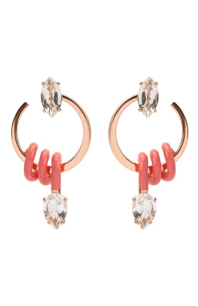 Небольшие серьги в виде незамкнутых колец помогут поставить акцент в образе. Нужное настроение задает подвеска из стерлингового серебра в виде вьющегося стебля с розовым глянцевым покрытием эмалью. Блеск такой детали поддерживают два прозрачных элемента из горного хрусталя.