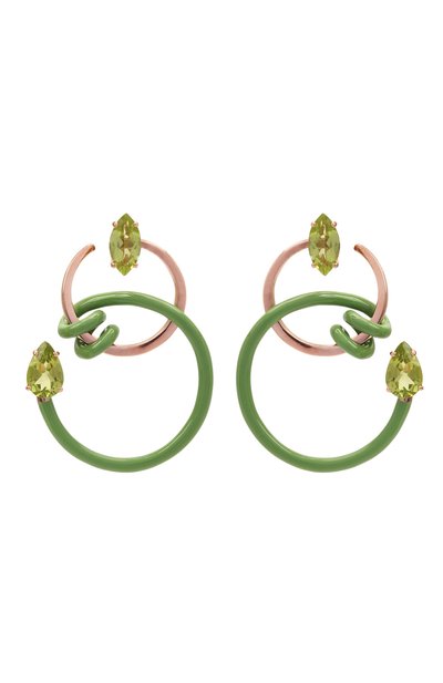 Серьги в виде незамкнутого кольца с изогнутой подвеской из стерлингового серебра, покрытой зеленой глянцевой эмалью, вдохновлены любовью Беа Бонджиаска к причудливым природным формам вьющихся растений. Особенно выразительно на таком фоне смотрятся однотонные мерцающие хризолиты.