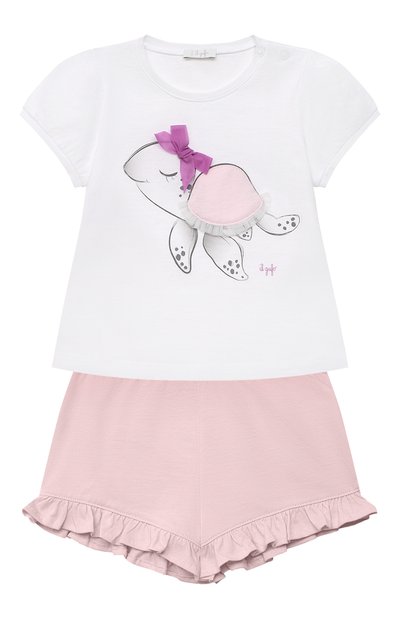 Белая футболка с объемным декором в виде черепахи будет хорошим решением и для прогулки, и для отдыха. Для пошива модели с кнопочной планкой мастера марки использовали дышащее хлопковое джерси. Из подобного выполнили и пастельно-розовые шорты с эластичным поясом и широкими оборками снизу.
