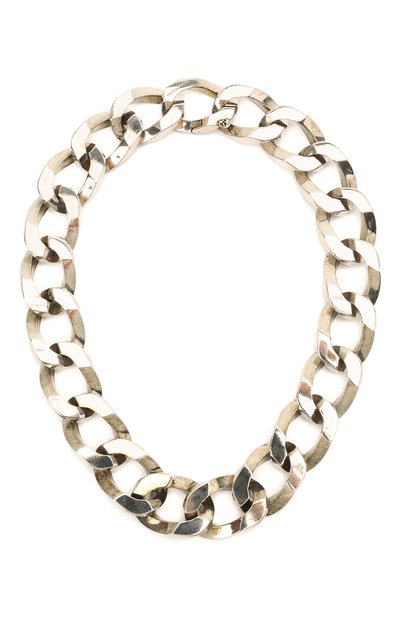 Колье в виде крупной цепи – драматичная альтернатива украшениям со сверкающими кристаллами. Холодный блеск полированного ювелирного сплава с гальваническим серебряным покрытием подчеркивает форму изогнутых граненых звеньев. Выполненный вручную аксессуар фиксируется карабином с миниатюрным объемным черепом.