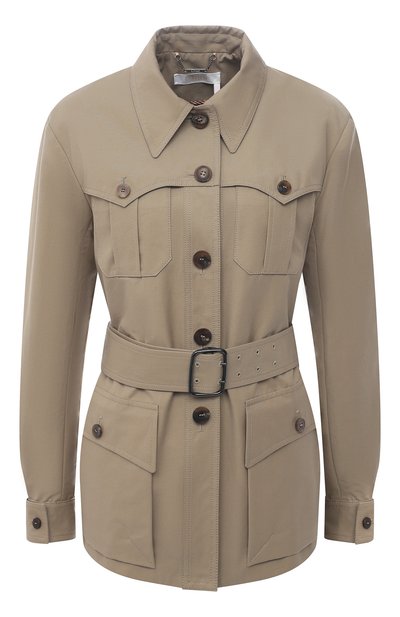 Куртка цвета хаки, детали которой позаимствовали у тренча, вошла в весенне-летнюю коллекцию. Для пошива изделия с крупными накладными карманами Наташа Рамсей-Леви выбрала плотный хлопковый канвас, защищающий от ветра. В комплект включили широкий пояс, который поможет подчеркнуть талию.