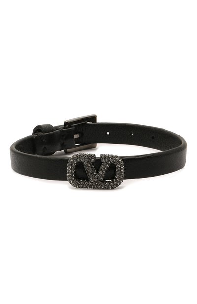 Для изготовления черного узкого браслета мастера марки использовали мягкую матовую кожу. Спереди изделие декорировали деталью в виде архивной эмблемы VLogo, которую инкрустировали россыпью однотонных мерцающих кристаллов. Посадка аксессуара регулируется металлической пряжкой и шлевкой.