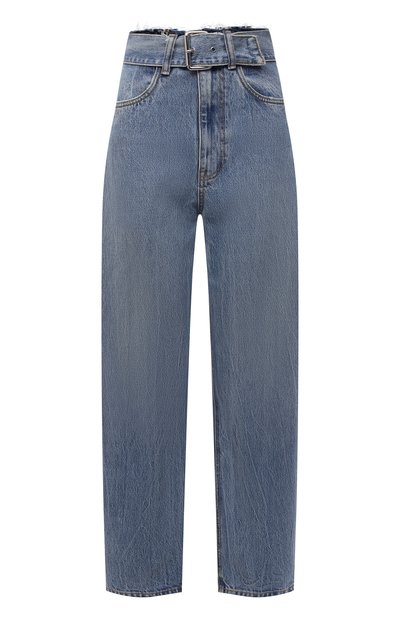 Голубые джинсы из весенне-летней коллекции выглядят достаточно нейтрально, чтобы поладить с любым верхом. Из нюансов у модели свободного кроя только подчеркнуто небрежный край и широкий вшитый ремень, которые выделяют талию. Для пошива изделия Александр Вэнг выбрал плотный фактурный хлопок с небольшими потертостями.
