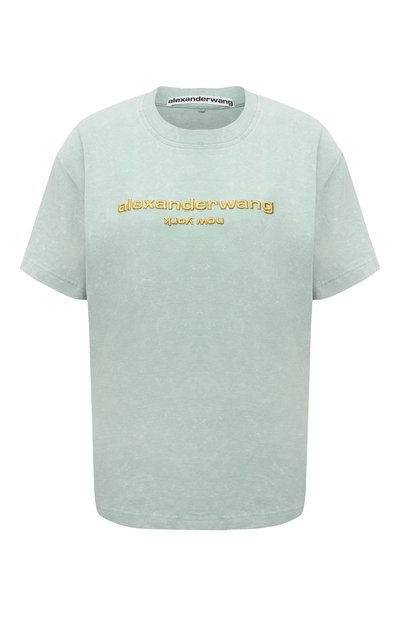 Голубая футболка из весенне-летней коллекции будет хорошим дополнением к повседневному гардеробу. Легкое хлопковое джерси обеспечивает необходимую степень комфорта, а неоднородный цвет, получившийся после обработки отбеливателем, отвечает за внешний вид. Александр Вэнг украсил модель вышивкой в виде логотипа бренда.
