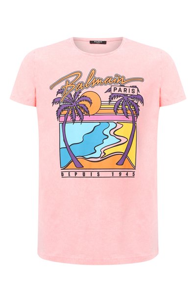 Футболка из весенне-летней коллекции выглядит ярко. На светло-розовом фоне Оливье Рустен разместил крупный красочный принт с пейзажем. Надпись под рисунком отсылает к важному событию в истории марки, когда Пьер Бальман открыл свое первое ателье в 1945 году. Для пошива модели мастера бренда использовали плотное хлопковое джерси.
