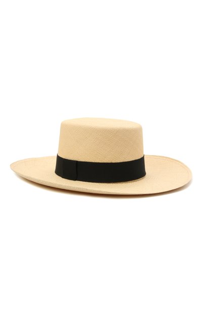 Канотье песочного оттенка поможет правильно расставить акценты в летнем образе. Для создания модели использовали гибкое пальмовое волокно, которое хорошо пропускает воздух, но блокирует вредные ультрафиолетовые лучи. Высокую тулью украсили контрастной черной лентой.