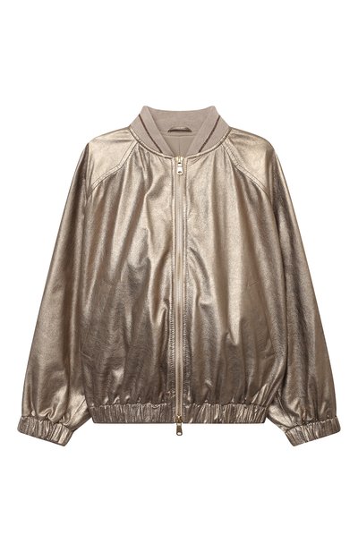 Для пошива золотистого бомбера с эластичными вставками на манжетах и поясе мастера марки использовали тонкую бархатистую замшу с эффектом ламе. Изделие из такого материала получилось легким, а благодаря свободному крою и рукавам реглан не сковывает движения. Трикотажный воротник-стойку декорировали знаковыми мерцающими цепочками мониль.