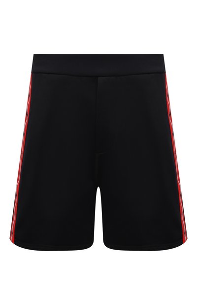 В весенне-летнюю коллекцию вошли черные шорты с контрастными красными лампасами, декорированными жаккардовым узором в виде логотипа бренда. Мастера марки выполнили модель из прочного хлопкового трикотажа, который не деформируется и не пилингуется после многократных стирок. Свободный крой не сковывает движения, а за удобную посадку отвечает широкий эластичный пояс.