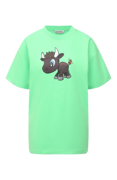 На создание капсульной коллекции, в которую вошла и эта кислотно-зеленая футболка, Демну Гвасалию вдохновил символ Нового Года по китайскому календарю. Модель, представленную эксклюзивно в ЦУМе, дизайнер украсил ярким мультяшным принтом в виде теленка. Для пошива изделия с короткими рукавами мастера марки, основанной Кристобалем Баленсиагой, использовали тонкий дышащий хлопок джерси, не сковывающий движения.