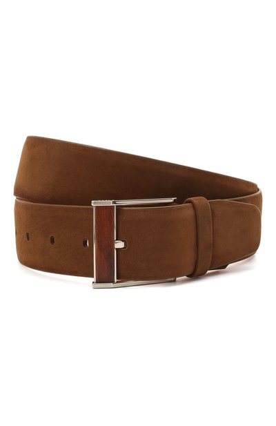 Мастера марки вручную изготовили этот ремень оттенка сепии из мягкой бархатистой кожи с незаметным на первый взгляд крупнозернистым рисунком. Цвету фактурного материала вторит небольшая вставка из полированного дерева с естественным узором, подчеркнувшая узкую прямоугольную пряжку.