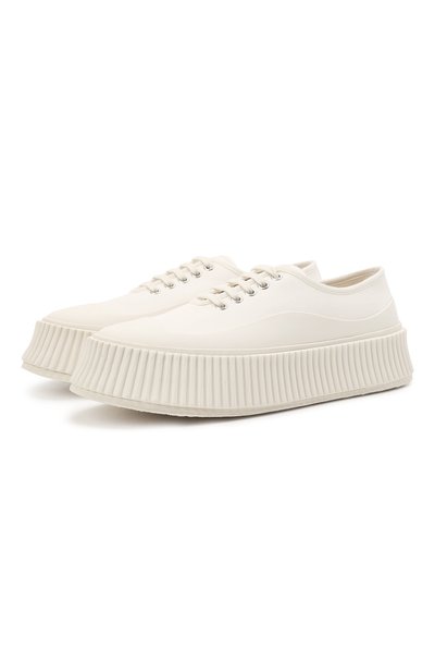 Белые кеды давно расстались со своим спортивным прошлым, получив статус универсальной повседневной обуви. Отличный пример – эта модель на нарочито массивной рифленой подошве. Для пошива пары из весенне-летней коллекции бренда, основанного Джин Сандер, использовали плотный легкий текстиль.