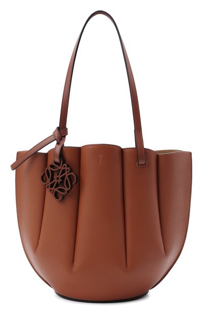 Карамельная сумка Shell из коллекции сезона весна-лето громко заявляет о своей принадлежности бренду: одну из ручек декорировали крупной анаграммой, символизирующей четыре поколения семьи Лоэве. Мастера марки выполнили аксессуар, форма которого напоминает ракушку, из мягкой тонкой кожи с легким матовым блеском.