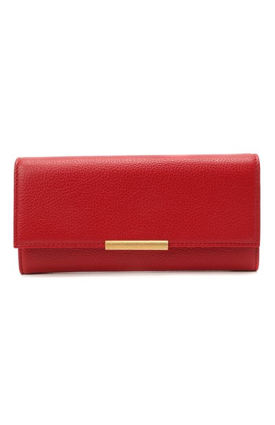 Ярко-красный кошелек сшили из матовой мерейной кожи. На этом прочном материале долго не появятся потертости и царапины, поэтому такой аксессуар будет выглядеть как новый не один сезон. Откидной клапан украсили золотистой гильошированной планкой. Внутри — отделения для банкнот и чеков, 10 слотов для пластиковых карт и карман на молнии для монет.