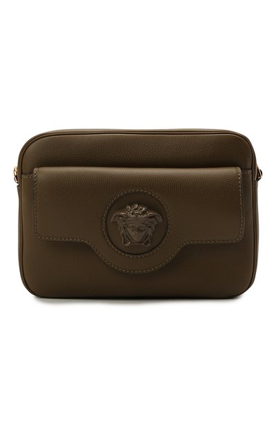 У небольшой сумки La Medusa из межсезонной коллекции марки, основанной Джанни Версаче, есть все шансы занять место любимого повседневного аксессуара. Ее аргументы: практичный оттенок хаки, регулируемый плечевой ремень и вместительное отделение, где удобно хранить кошелек, планшет и флакон аромата. Модель из матовой зернистой кожи традиционно украсили рельефным изображением головы горгоны Медузы, вдохновленным декором на дверях первого миланского офиса бренда.