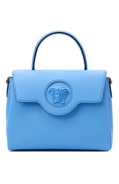 Для сумок из линии La Medusa, впервые представленных в сезоне весна-лето 2021 года, Донателла Версаче выбрала богатую цветовую палитру. Например, эту вместительную модель со съемным плечевым ремнем сшили из мягкой высококачественной кожи, окрашенной в насыщенный голубой оттенок. В такой же гамме изготовили глянцевые объемный барельеф в виде головы Медузы на откидном клапане и массивную цепь, выполняющую роль еще одной ручки.