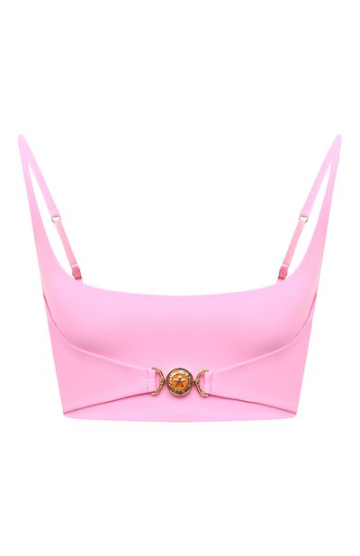 Топ сочного розового оттенка поможет сделать образ по-летнему ярким. Для пошива модели с глубоким декольте и узкими регулируемыми бретелями Донателла Версаче выбрала мягкое прочное джерси. Из такого же эластичного материала выполнили фигурные ремешки с золотистой фирменной пряжкой. Эти формирующие эффект многослойности детали не только служат декором, но скрывают молнию сбоку. Изделие вошло в коллекцию сезона весна-лето.
