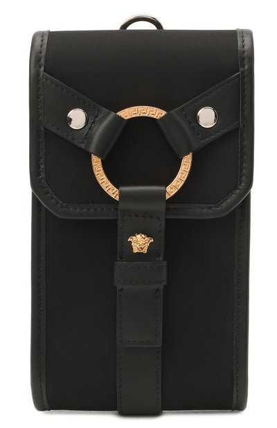 Черный чехол сшили из плотного текстиля, а для большей прочности края укрепили кожей. Из нее же выполнили конструкцию из ремешков, напоминающую портупею. Детали зафиксировали на позолоченном кольце со знаковым меандровым узором. Еще одним узнаваемым элементом стала заклепка в форме головы горгоны Медузы. Для удобства предусмотрели съемный ремень-петлю.