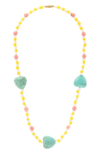 Для изготовления колье мастера марки использовали блестящий белый и желтый бисер, а также матовый хаулит, из которого выполнили миниатюрные розовые бусины и крупные зеленые детали в форме сердца. Винтовая застежка из легкого ювелирного сплава, покрытого 18-каратным золотом, долго не потускнеет.