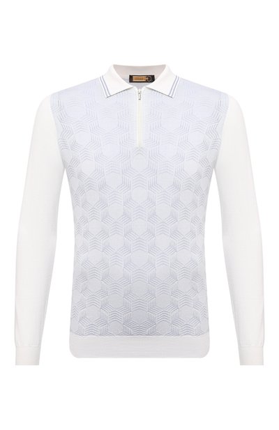 Белое поло из весенне-летней коллекции ставит знак равенства между модой и комфортом. Для производства изделия использовали тонкий нежный шелк, который почти не ощущается на коже. Переплетение волокон разной толщины складывается в еле заметный жаккардовый узор. Привычную планку с пуговицами заменили на короткую молнию.