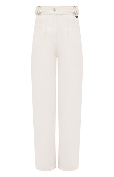 Молочно-белые брюки прямого кроя, с высокой посадкой и вытачками на бедрах сшиты из гладкого плотного хлопка. Ширина пояса регулируется ремешками с пряжками. Однотонная модель из коллекции сезона весна-лето украшена сбоку небольшим логотипом марки.
