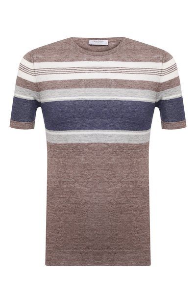 В пошиве одежды дизайнеры бренда особое внимание уделяют материалам. Для создания джемпера с короткими рукавами использовали тонкую льняную пряжу. Такая модель способна на три-четыре градуса охлаждать кожу, отталкивает неприятные запахи и не дает микробам размножаться, гарантируя комфорт и свежесть на весь день. При вязке бежевые нити соединили с синими, серыми и белыми, сформировав полосатый узор.