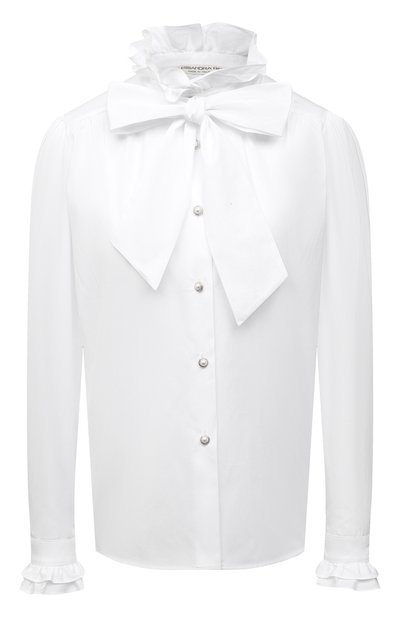 Белая блуза из весенне-летней коллекции получилась женственной. На это работает и крупный съемный бант, и оборки на воротнике и манжетах. Для пошива модели Алессандра Рич выбрала тонкий хлопковый поплин. Такое изделие поможет разбавить классический офисный дресс-код.