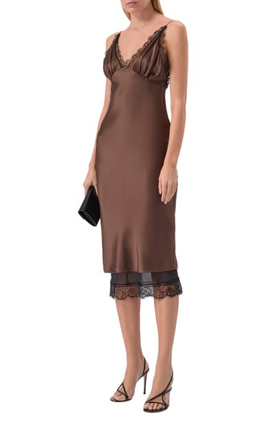 Короткое платье из круизной коллекции бренда, основанного Ивом Сен-Лораном, сочетает в себе женственность и дерзкий характер. За первое отвечают черные кружевные вставки с цветочным мотивом, которые разместили вдоль краев, за второе — мягкий шелк с леопардовым мотивом.